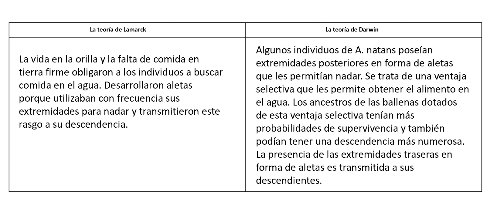 b) Explicando las teorías de Darwin y de Lamarck ayudándote del ejemplo de la evolución de las ballenas. Fíjate en los dibujos que figuran al lado de los bocadillos.